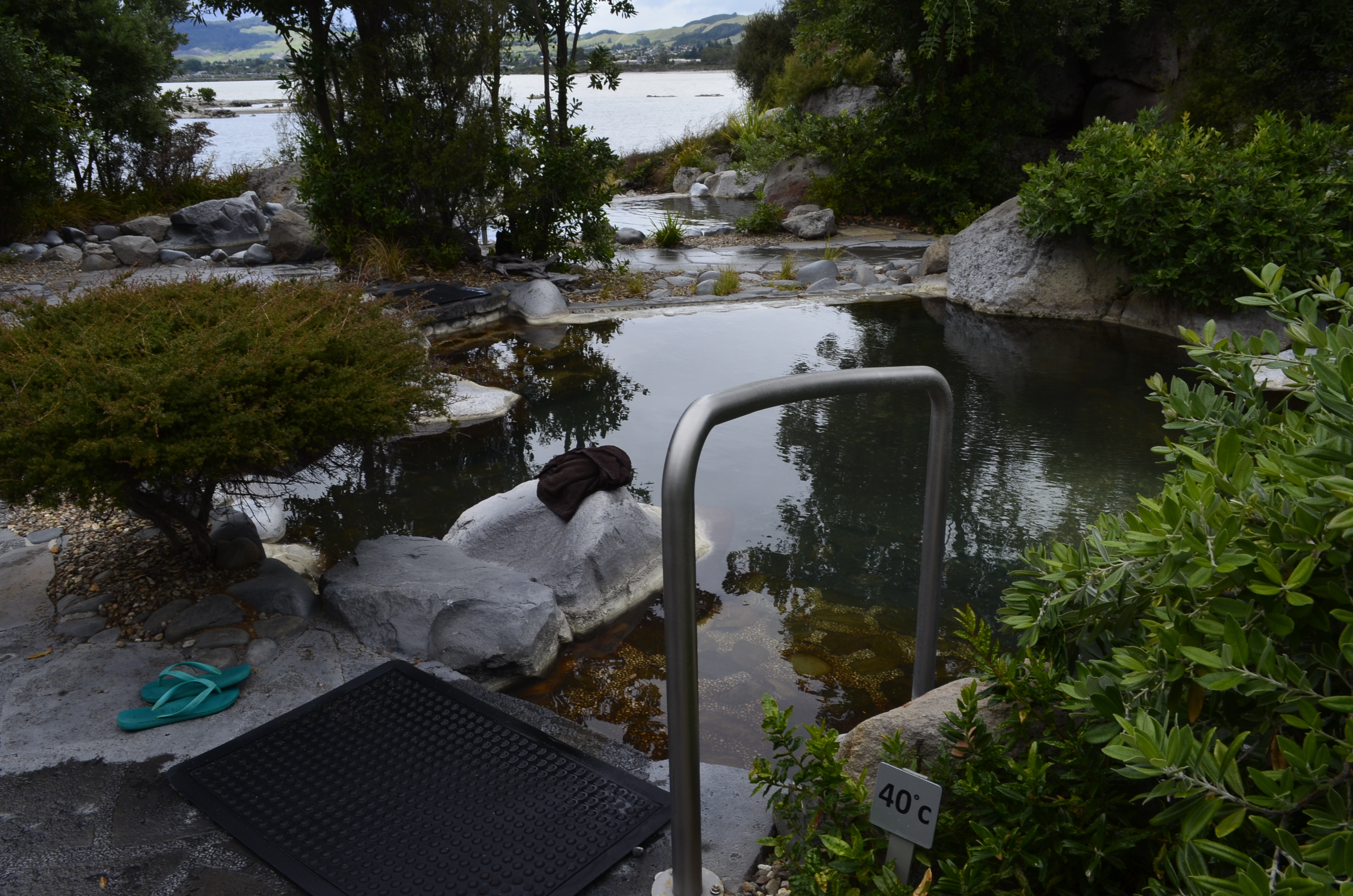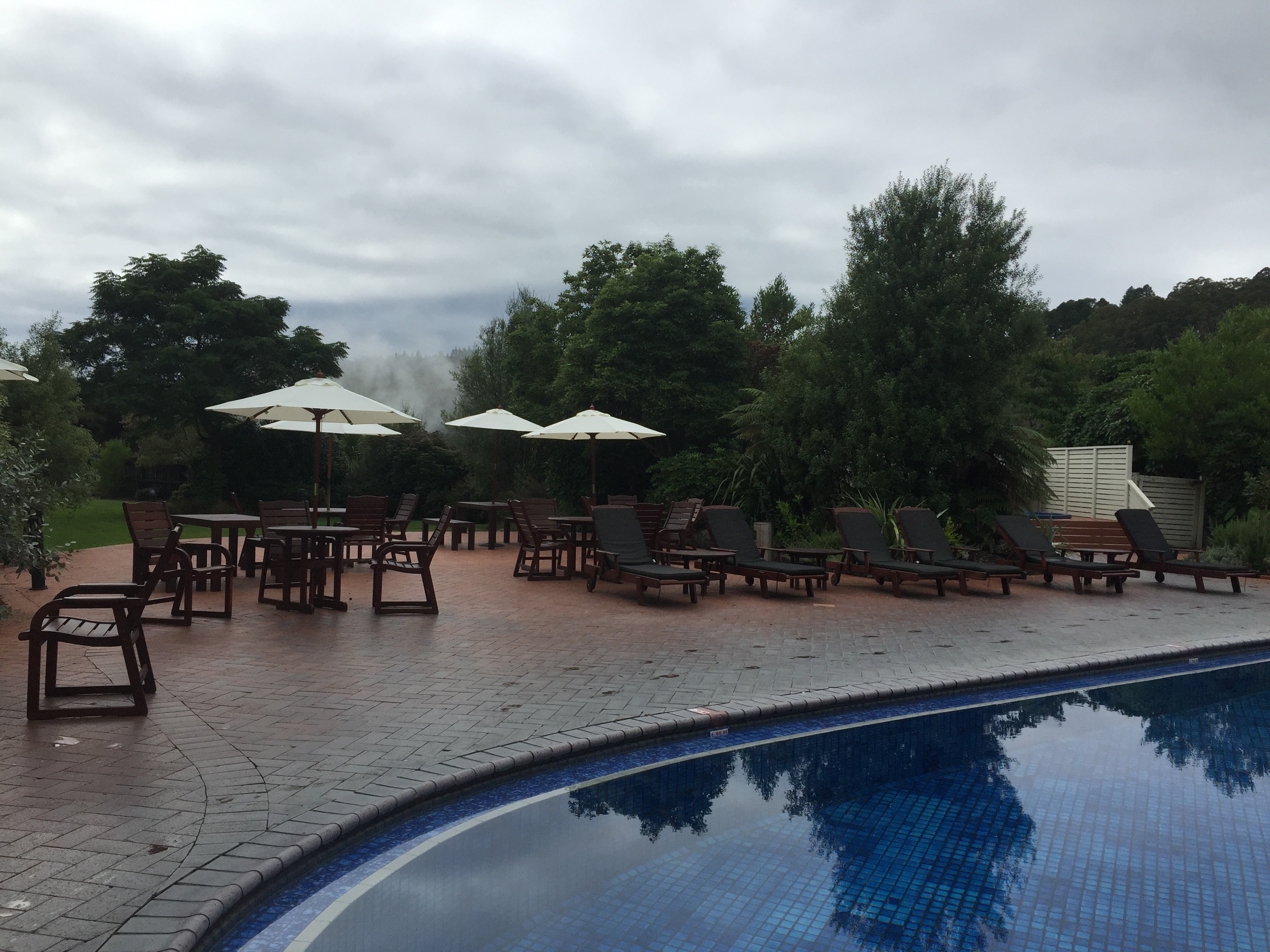 Piscina do Holiday Inn Rotorua onde ficamos com piscina de água quentinha. Reparem a fumacinha saindo lá do meio das arvores no fundo do jardim do hotel. Adoramos tudo lá e se pudesse ficaria pelo menos 2 noites.
